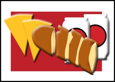 Two small items with garlic bread and two canned drinks.